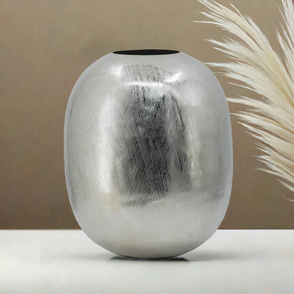 Modern artistry meets timeless elegance in the Aluminio Silver Streaks Vase. Its sleek, rounded form and gleaming silver finish with subtle streaks exude understated luxury. Perfect for holding fresh or dried flowers, or simply as a standalone accent, this vase brings a contemporary touch to any space.