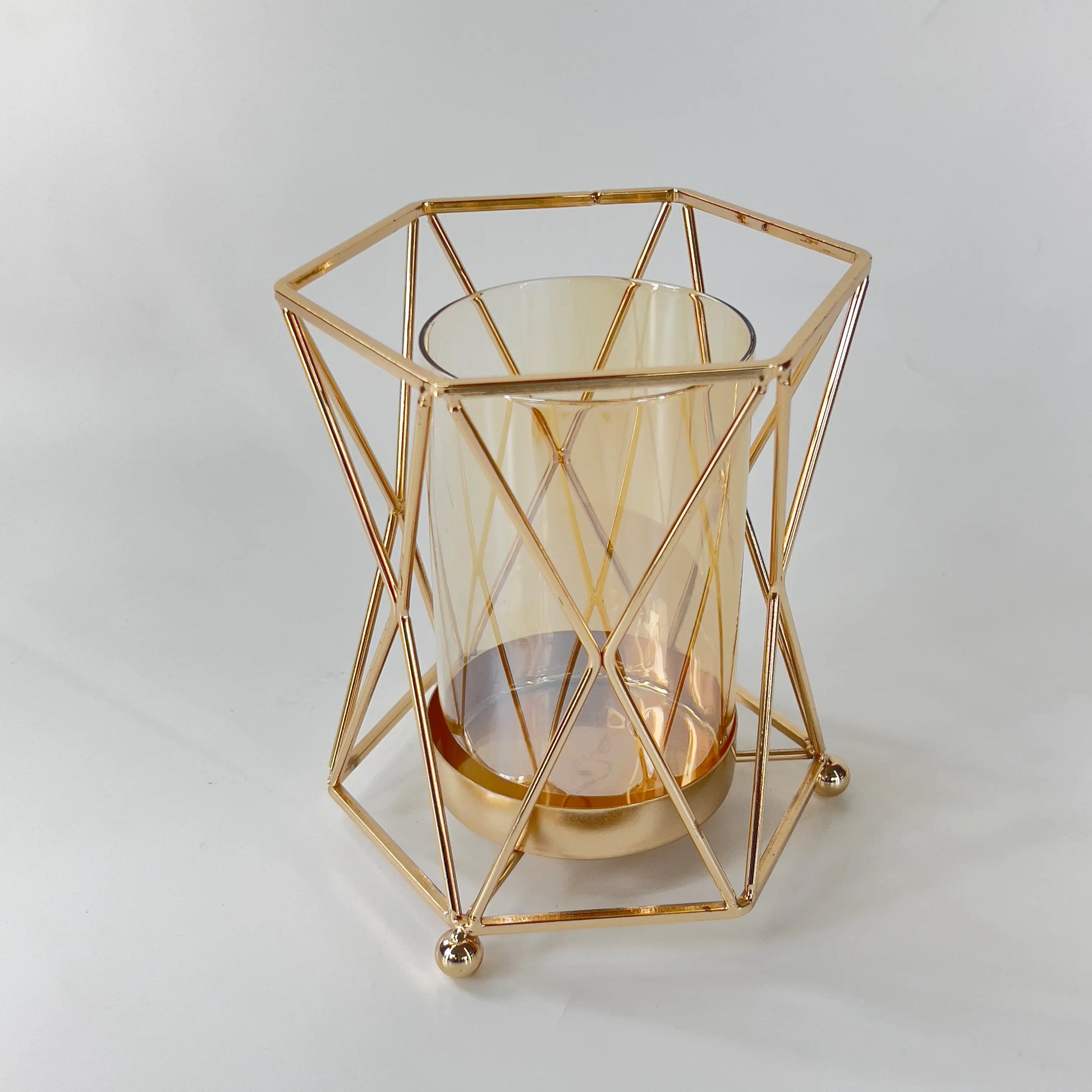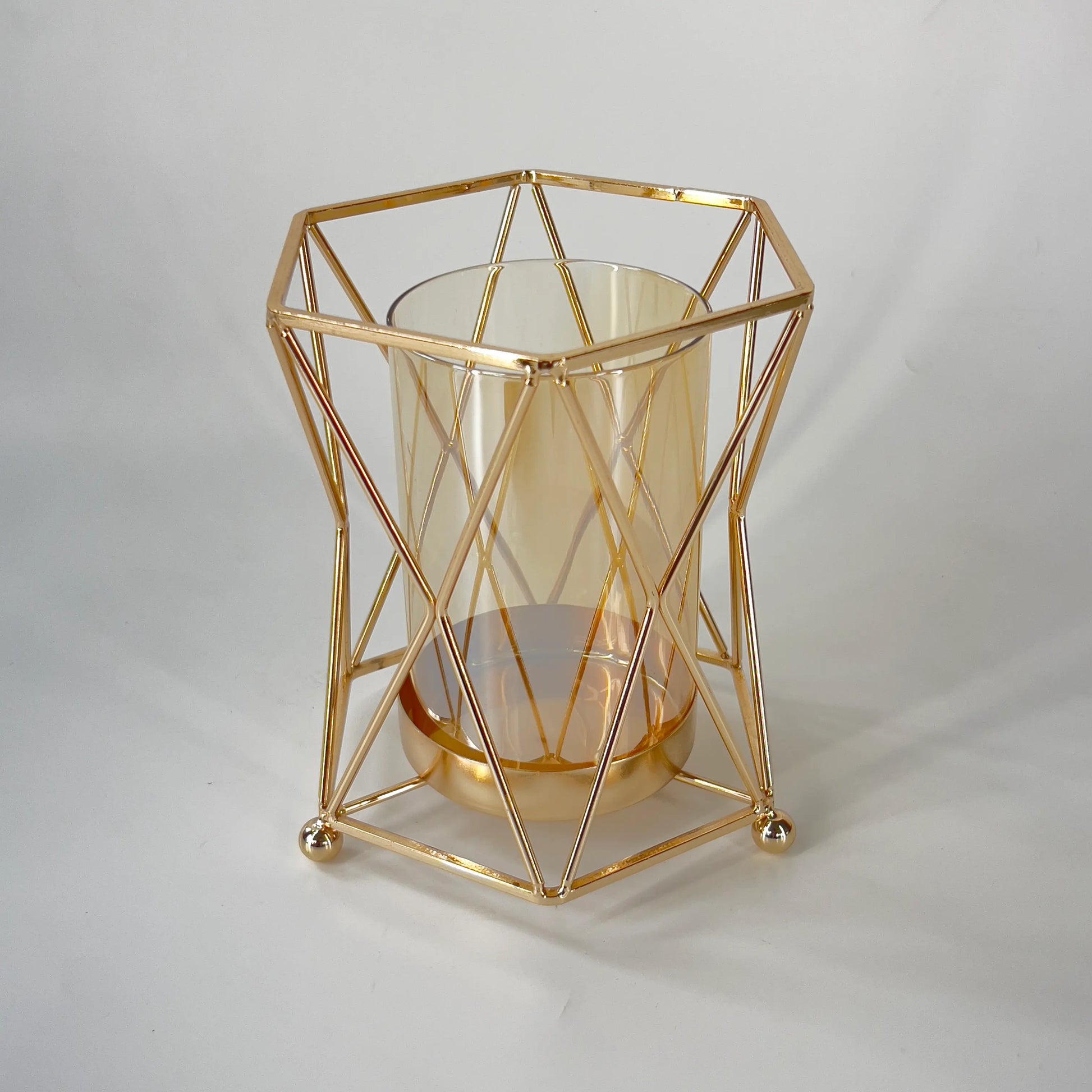 The Awan Candle Holder is a striking fusion of geometry and glow. Featuring a warm-toned cylindrical glass vessel nested within an intricate gold metal frame, it exudes modern luxury while casting a soft, ambient light. The structural lines of the frame add an architectural elegance, making it as much a sculpture as a functional decor piece.