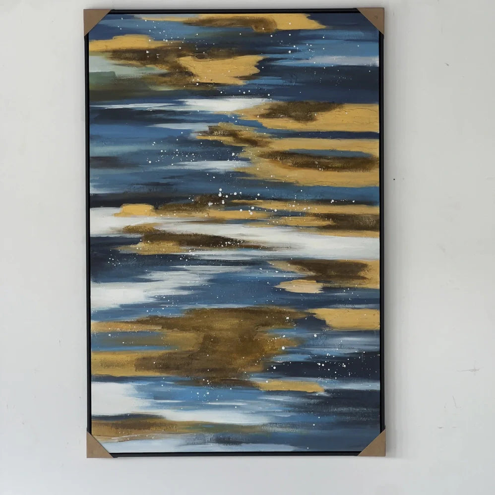 Dive into the celestial charm of "In The Sky 2," an abstract masterpiece inspired by the ever-changing hues of the sky. With a harmonious blend of deep blues, warm golden strokes, and delicate specks of white, this artwork evokes a dreamy, ethereal ambiance. The dynamic composition brings a sense of motion and tranquility, making it a captivating addition to any room.