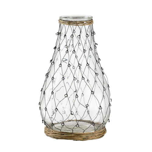Inspired by coastal elegance, the Luminous Fishnet Glass Vase features a clear glass body encased in an intricately woven jute fishnet. The combination of transparent glass and rustic rope detailing creates a charming nautical aesthetic. Ideal for fresh blooms or as a decorative accent, this vase effortlessly brings a touch of seaside serenity to your space.