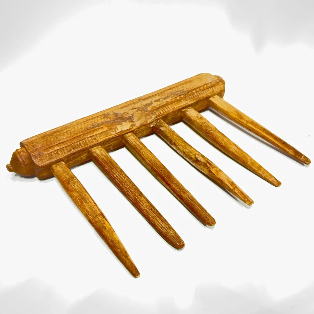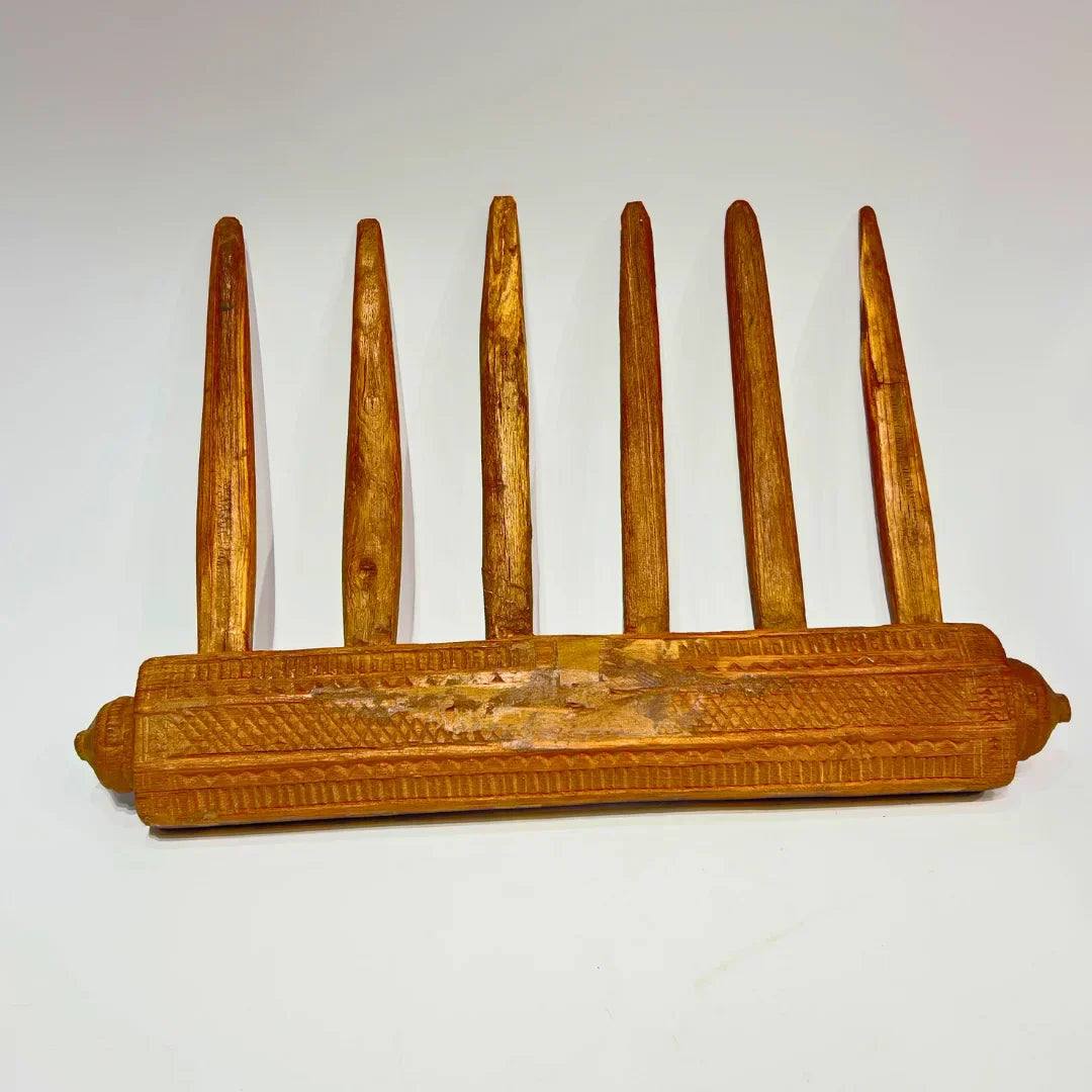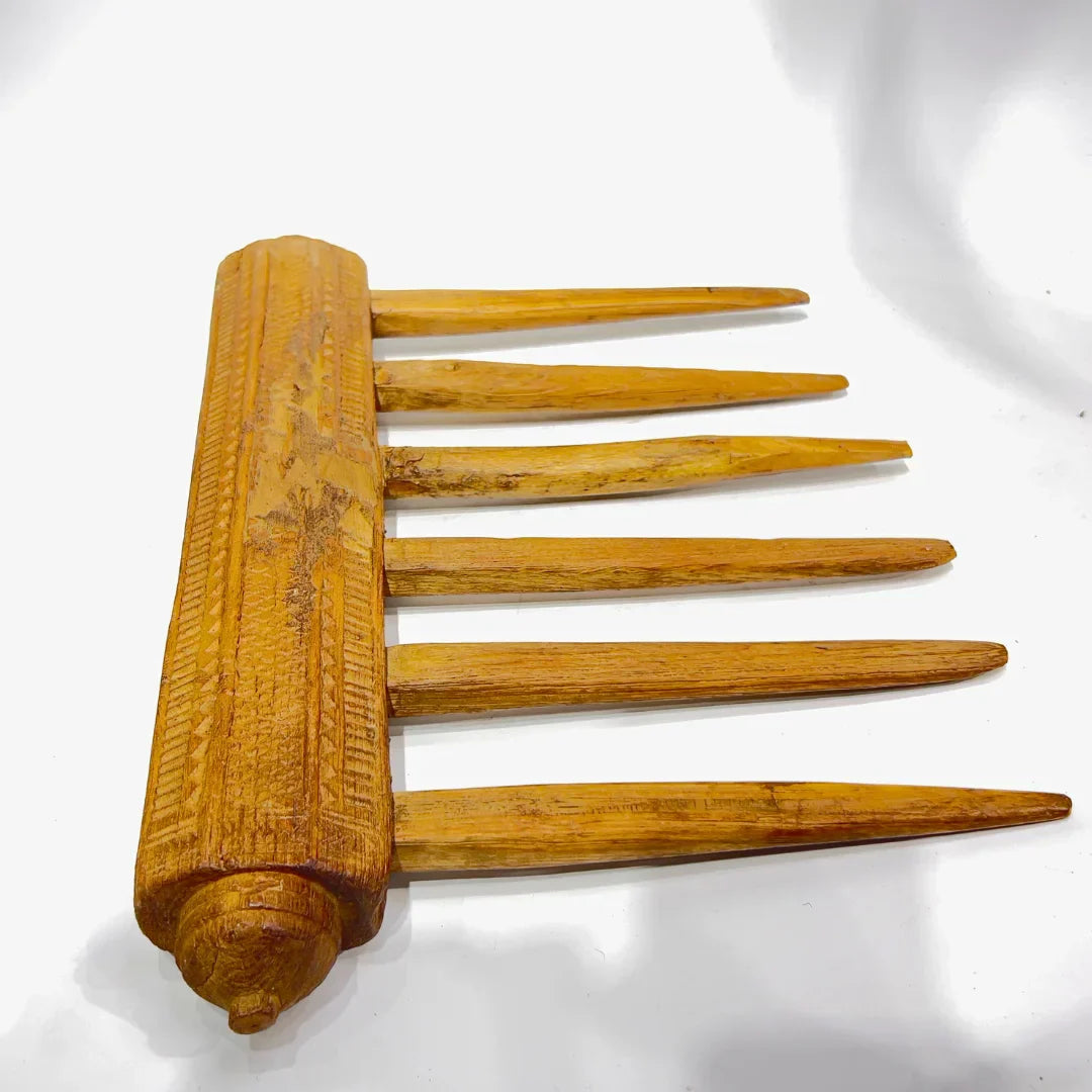 The Pattiyan Wooden Handle is a traditional handcrafted piece, originally used in agricultural or weaving tools. Its elongated spikes and detailed carved handle showcase the expertise of rural craftsmanship. The natural aging of the wood adds a rustic appeal, making it a perfect decor item for those who appreciate vintage artifacts with cultural significance.