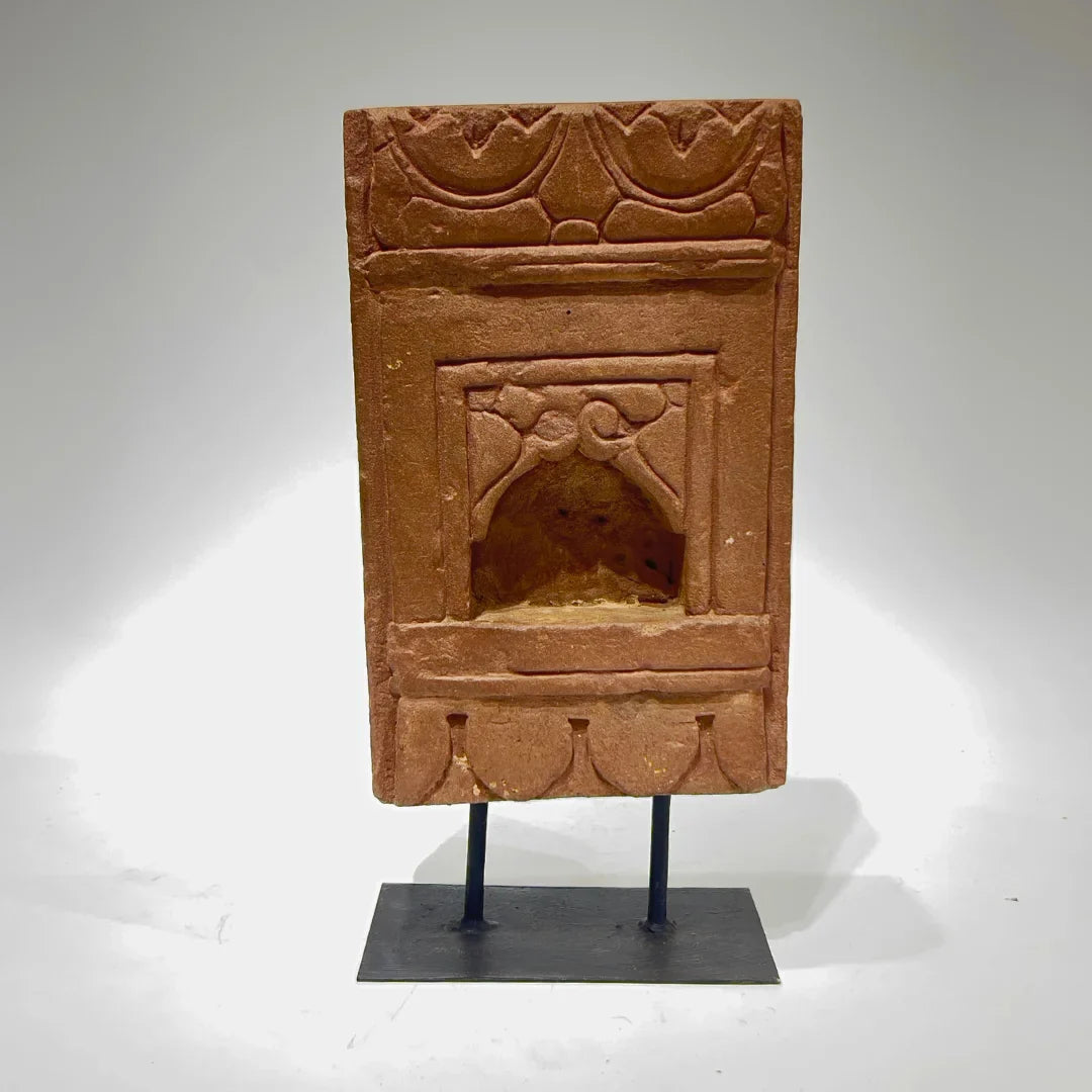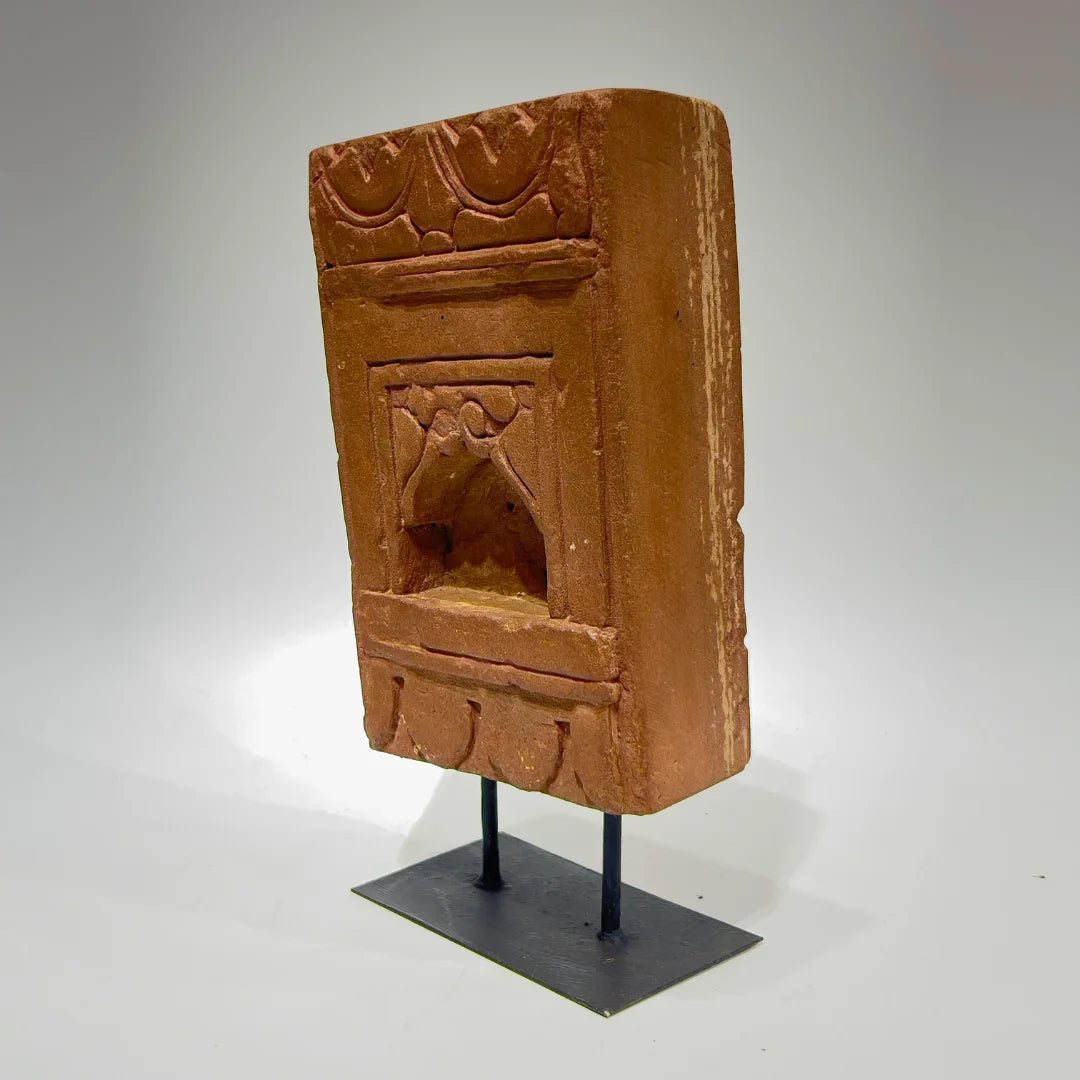 The Prakash Stone Lamp embodies old-world charm with its intricate carvings and traditional arched alcove. Carved from warm terracotta stone, it features elegant motifs and ornamental details reminiscent of historical Indian architecture. The textured surface and timeless craftsmanship make it a perfect statement piece. Mounted on an iron stand, it seamlessly integrates into contemporary or heritage-inspired spaces.