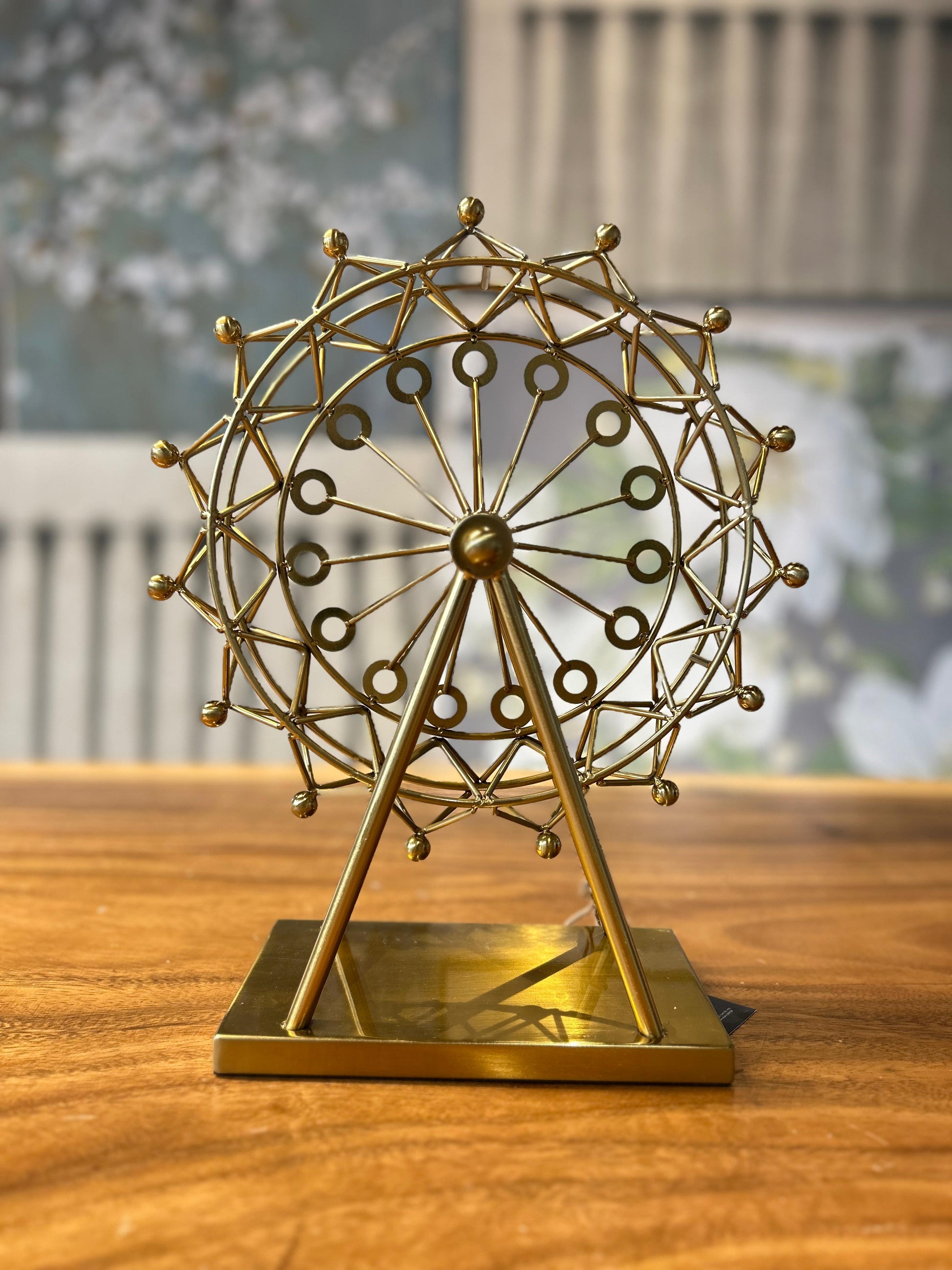 Elevate your living space with the delightful Somers Roundabout Wheel Decor, an artistic piece inspired by the charm of a classic Ferris wheel. Crafted from gleaming metal with a golden finish, this decor accent brings a playful yet elegant vibe to any setting. Its intricate design and smooth surface add a refined touch, making it a captivating focal point.