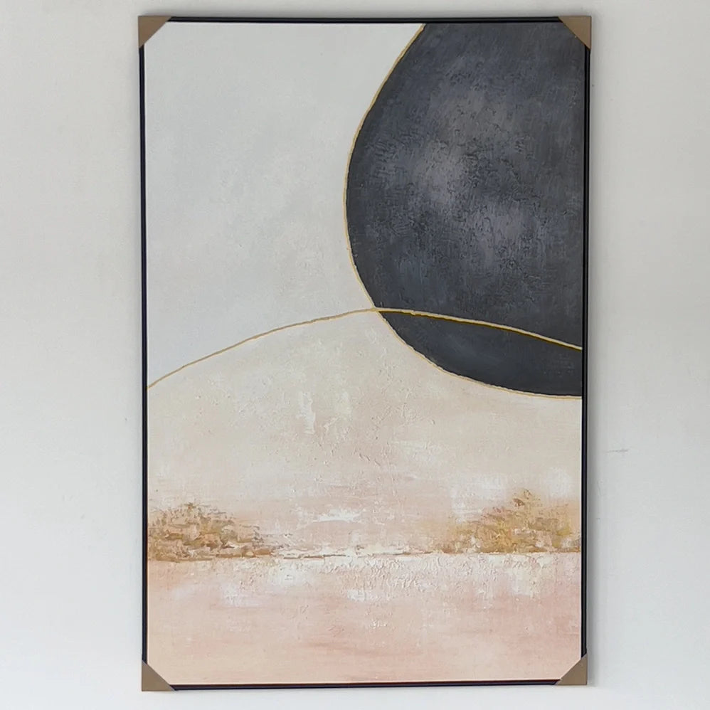 Immerse yourself in the serene beauty of "Stellar Tranquility," a captivating artwork that blends abstract celestial elements with soft earthy tones. The contrast between the deep, textured dark sphere and the muted, pastel background creates a balance that evokes calmness and contemplation. The subtle golden accents gracefully divide the composition, adding a touch of elegance and luxury to the piece.