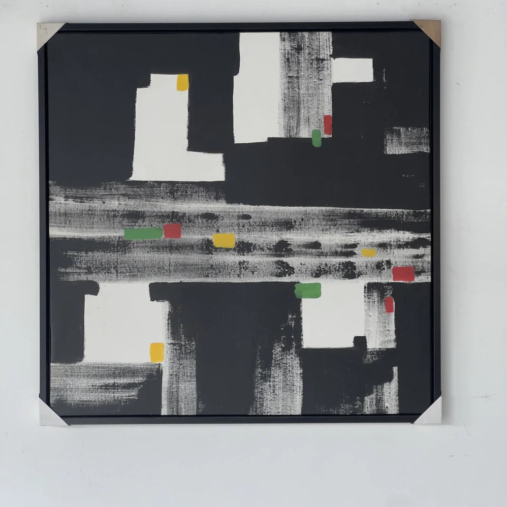 Captivating and enigmatic, "Tranquil Delight" brings a harmonious blend of structured geometry and bold abstraction. The black canvas serves as a dramatic backdrop, punctuated with textured white spaces and pops of vibrant green, red, and yellow. This composition offers an edgy yet balanced aesthetic, perfect for curating a striking visual experience in modern spaces.