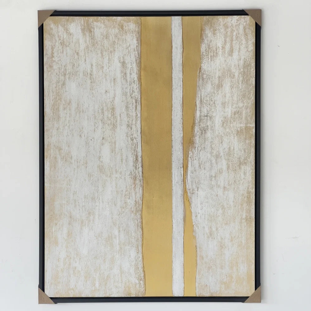 Elegant and understated, "Whispering Embers" is a sophisticated blend of textures and tones, featuring a golden vertical accent amidst a muted white and beige backdrop. The gentle interplay of metallic sheen and rustic finishes evokes a sense of balance and timeless charm, making it an exquisite addition to contemporary interiors.